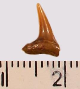 Мелкий боковой зуб с коронкой охристого цвета, режущего типа, с гладким режущим краем. Корень темно-охристый, арочный, умеренно массивный, со следами сильной окатанности и сколами. Добавочные зубцы коронки отсутствуют.