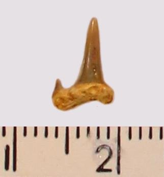 Мелкий боковой зуб с коронкой темного, желтовато-серого цвета, режущего типа, с гладким режущим краем. Корень охристый, арочный, умеренно массивный, со следами сильной окатанности и сколами; правая ветвь утрачена. Имелась одна пара добавочных зубцов коронки, сохранился только левый.