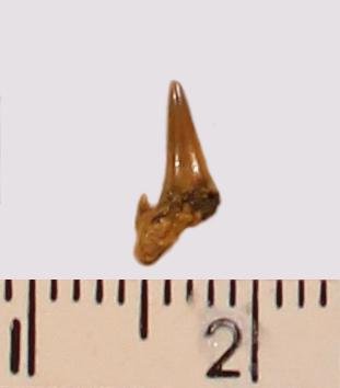 Мелкий боковой зуб с коронкой желтовато-бурого цвета, режущего типа, с гладким режущим краем. Корень грязно-охристый, арочный, умеренно массивный; правая ветвь утрачена. Имелась одна пара добавочных зубцов коронки, сохранился только левый.