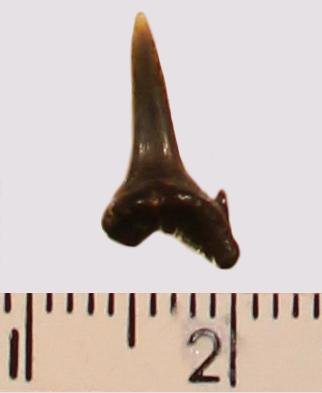 Мелкий боковой зуб с коронкой черного цвета, режущего типа, с гладким режущим краем. С лингвальной стороны у основания коронки на эмали имеется скульптура в виде слабой продольной струйчатости. Корень черный, арочный, умеренно массивный; левая ветвь утрачена. С лингвальной стороны корня питательная борозда. Имелась одна пара добавочных зубцов коронки, сохранился только правый.