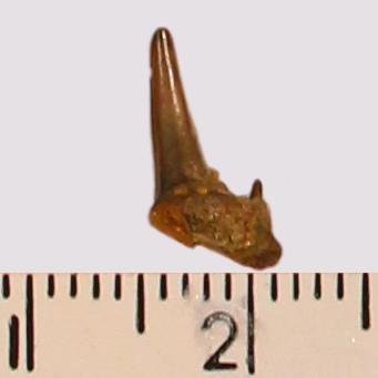 Мелкий боковой зуб с коронкой серо-бурого цвета, режущего типа, с гладким режущим краем. Корень бурый, арочный, умеренно массивный, со следами сильной окатанности; левая ветвь утрачена. Имелась одна пара добавочных зубцов коронки, сохранился только правый.