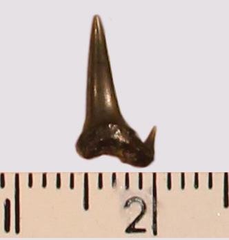 Мелкий боковой зуб с коронкой черного цвета, режущего типа, с гладким режущим краем. Корень черный, арочный, умеренно массивный, со следами сильной окатанности; левая ветвь утрачена. Имелась одна пара добавочных зубцов коронки, сохранился только правый.