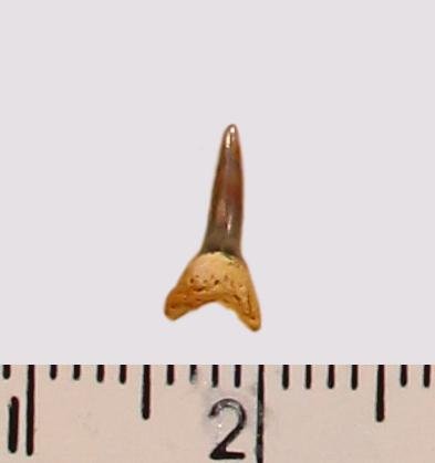 Мелкий боковой зуб с коронкой темно-серого цвета, колюще-режущего типа, с гладким режущим краем. С лингвальной стороны у основания коронки на эмали имеются следы скульптуры в виде слабой продольной струйчатости. Корень светло-охристый, арочный, умеренно массивный, со следами сильной окатанности. Добавочные зубцы коронки отсутствуют.