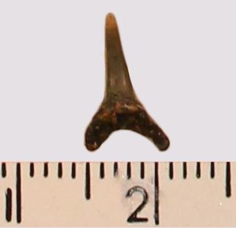 Мелкий боковой зуб с коронкой темно-серого цвета, колюще-режущего типа, с гладким режущим краем. Корень черный, арочный, умеренно массивный, со следами окатанности. С лингвальной стороны корня питательная борозда. Добавочные зубцы коронки отсутствуют.