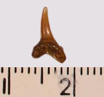 Мелкий боковой зуб с коронкой темного, охристо-бежевого цвета, режущего типа, с гладким режущим краем. Корень бурый, арочный, умеренно массивный, со следами сильной окатанности и эрозии. С лингвальной стороны корня питательная борозда. Добавочные зубцы коронки отсутствуют.
