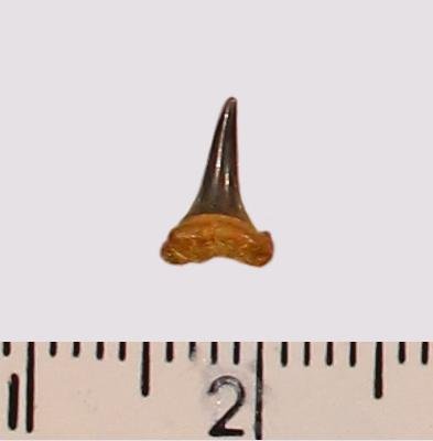 Мелкий боковой зуб с коронкой черного цвета, режущего типа, с гладким режущим краем. Корень охристый, арочный, умеренно массивный, со следами сильной окатанности. С лингвальной стороны корня питательная борозда. Добавочные зубцы коронки отсутствуют.