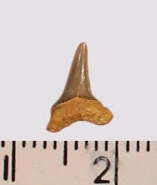 Мелкий боковой зуб с коронкой темно-серого цвета, режущего типа, с гладким режущим краем. С лингвальной стороны у основания коронки на эмали имеется скульптура в виде слабой продольной струйчатости. Корень серо-охристый, арочный, умеренно массивный, со следами сильной окатанности. Добавочные зубцы коронки отсутствуют.