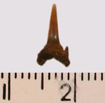 Мелкий боковой зуб с коронкой темно-бежевого цвета, колюще-режущего типа, с гладким режущим краем. Корень бурый, арочный, умеренно массивный, со следами окатанности и мелкими сколами. С лингвальной стороны корня питательная борозда. Имелась одна пара добавочных зубцов коронки, сохранился только правый.