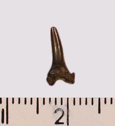 Мелкий боковой зуб с коронкой черного цвета, колюще-режущего типа, с гладким режущим краем. С лингвальной стороны у основания коронки на эмали имеются следы скульптуры в виде слабой продольной струйчатости. Корень черный, арочный, умеренно массивный, со следами сильной окатанности и сколами. С лингвальной стороны корня питательная борозда. Имелась одна пара добавочных зубцов коронки, сохранился только правый.