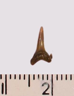 Мелкий боковой зуб с коронкой темно-бежевого цвета, режущего типа, с гладким режущим краем. С лингвальной стороны у основания коронки на эмали имеется скульптура в виде слабой продольной струйчатости. Корень черно-бурый, арочный, умеренно массивный, со следами окатанности. С лингвальной стороны корня питательная борозда. Имелась одна пара добавочных зубцов коронки, сохранился только правый.