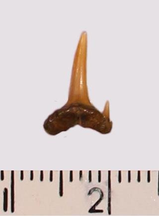 Мелкий боковой зуб с коронкой охристого цвета, режущего типа, с гладким режущим краем. Корень бурый, арочный, умеренно массивный, со следами окатанности. С лингвальной стороны корня питательная борозда. Имелась одна пара добавочных зубцов коронки, сохранился только правый.