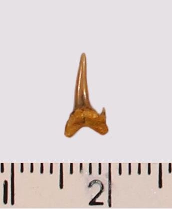 Мелкий боковой зуб с коронкой серо-охристого цвета, режущего типа, с гладким режущим краем. Корень охристый, арочный, умеренно массивный, со следами окатанности. С лингвальной стороны корня питательная борозда. Имелась одна пара добавочных зубцов коронки, сохранился только правый.