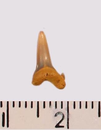 Мелкий боковой зуб с коронкой серого цвета, режущего типа, с гладким режущим краем. С лингвальной стороны у основания коронки на эмали имеется скульптура в виде слабой продольной струйчатости. Корень охристый, арочный, умеренно массивный, со следами сильной окатанности. С лингвальной стороны корня питательная борозда. Имелась одна пара добавочных зубцов коронки, сохранился только правый.