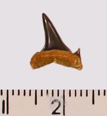 Мелкий боковой зуб с коронкой черного цвета, режущего типа, с гладким режущим краем. Корень темно-охристый, арочный, умеренно массивный, со следами окатанности. С лингвальной стороны корня питательная борозда. Имелась одна пара добавочных зубцов коронки, сохранился только правый.
