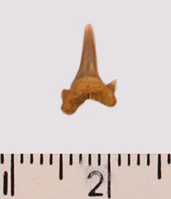 Мелкий боковой зуб с коронкой бежевого цвета, режущего типа, с гладким режущим краем. С лингвальной стороны у основания коронки на эмали имеются следы скульптуры в виде слабой продольной струйчатости. Корень охристый, арочный, умеренно массивный, со следами окатанности. С лингвальной стороны корня питательная борозда. Имелась одна пара добавочных зубцов коронки, сохранился только правый.