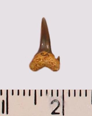 Мелкий боковой зуб с коронкой бурого цвета, режущего типа, с гладким режущим краем. С лингвальной стороны у основания коронки на эмали имеется скульптура в виде слабой продольной струйчатости. Корень охристый, арочный, умеренно массивный, со следами сильной окатанности и эрозии. Имелась одна пара добавочных зубцов коронки, сохранился только правый.