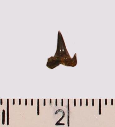 Мелкий задне-боковой зуб с коронкой черного цвета, режущего типа, с гладким режущим краем. Корень черный, арочный, умеренно массивный, со следами окатанности и эрозии. С лингвальной стороны корня питательная борозда. Имелась одна пара добавочных зубцов коронки, сохранился только правый.