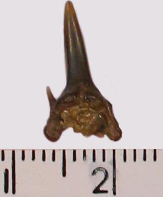 Мелкий передне-боковой? зуб с коронкой черного цвета, режущего типа, с гладким режущим краем. С лингвальной стороны у основания коронки на эмали имеется скульптура в виде слабой продольной струйчатости. Корень бурый, арочный, умеренно массивный, со следами окатанности и остатками вмещающей породы между ветвями. С лингвальной стороны корня питательная борозда. Имелась одна пара добавочных зубцов коронки, сохранился только левый.