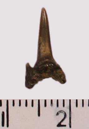 Мелкий передне-боковой зуб с коронкой черно-бурого цвета, режущего типа, с гладким режущим краем. Корень черный, арочный, умеренно массивный, со следами окатанности и мелкими сколами. С лингвальной стороны корня питательная борозда. Имелась одна пара добавочных зубцов коронки, сохранился только левый.