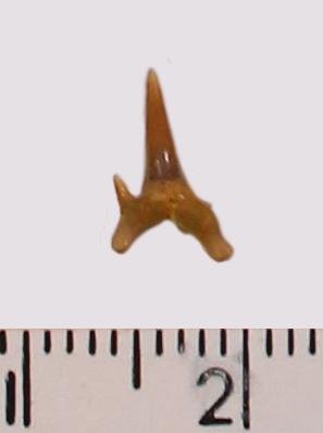 Мелкий боковой зуб с коронкой охристо-бежевого цвета, режущего типа, с гладким режущим краем. С лингвальной стороны у основания коронки на эмали имеется скульптура в виде слабой продольной струйчатости. Корень серо-охристый, арочный, умеренно массивный. С лингвальной стороны корня питательная борозда. Имелась одна пара добавочных зубцов коронки, сохранился только левый.