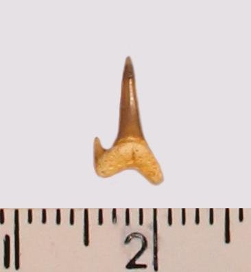 Мелкий боковой зуб с коронкой темно-бежевого цвета, режущего типа, с гладким режущим краем. С лингвальной стороны у основания коронки на эмали имеется скульптура в виде слабой продольной струйчатости. Корень светло-охристый, арочный, умеренно массивный, со следами окатанности. С лингвальной стороны корня питательная борозда. Имелась одна пара добавочных зубцов коронки, сохранился только левый.