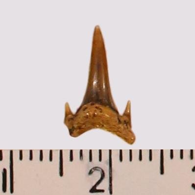 Мелкий боковой зуб с коронкой темного, охристо-бежевого цвета, режущего типа, с гладким режущим краем. С лингвальной стороны у основания коронки на эмали имеется скульптура в виде слабой продольной струйчатости. Корень серо-охристый, арочный, умеренно массивный, со следами сильной окатанности. Имеется одна пара добавочных зубцов коронки.
