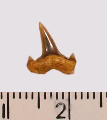 Мелкий боковой зуб с коронкой темно-бежевого цвета, режущего типа, с гладким режущим краем. С лингвальной стороны у основания коронки на эмали имеется скульптура в виде слабой продольной струйчатости. Корень охристый, арочный, умеренно массивный, со следами окатанности. С лингвальной стороны корня питательная борозда. Имеется одна пара добавочных зубцов коронки.