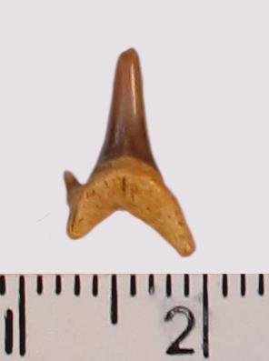 Мелкий боковой зуб с коронкой темно-бежевого цвета, режущего типа, с гладким режущим краем. С лингвальной стороны у основания коронки на эмали имеется скульптура в виде слабой продольной струйчатости. Корень охристый, арочный, умеренно массивный, со следами окатанности. С лингвальной стороны корня питательная борозда. Имелась одна пара добавочных зубцов коронки, сохранился только левый.