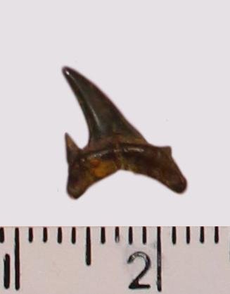 Мелкий боковой зуб с коронкой черного цвета, режущего типа, с гладким режущим краем. Корень черно-бурый, арочный, умеренно массивный. С лингвальной стороны корня питательная борозда. Имелась одна пара добавочных зубцов коронки, сохранился только левый.