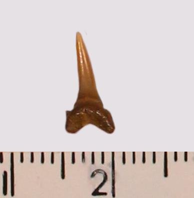 Мелкий боковой зуб с коронкой охристого цвета, режущего типа, с гладким режущим краем. С лингвальной стороны у основания коронки на эмали имеется скульптура в виде слабой продольной струйчатости. Корень темно-охристый, арочный, умеренно массивный, со следами окатанности. С лингвальной стороны корня питательная борозда. Имелась одна пара добавочных зубцов коронки, сохранился только левый.