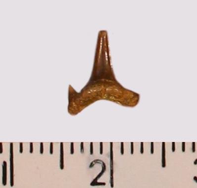 Мелкий боковой зуб с коронкой бурого цвета, режущего типа, с гладким режущим краем. Корень темно-охристый, арочный, умеренно массивный, со следами сильной окатанности. С лингвальной стороны корня питательная борозда. Имелась одна пара добавочных зубцов коронки, сохранился только левый.