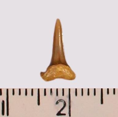 Мелкий боковой зуб с коронкой бежево-охристого цвета, режущего типа, с гладким режущим краем. Корень светло-охристый, арочный, умеренно массивный, со следами сильной окатанности. Имелась одна пара добавочных зубцов коронки, сохранился только левый.