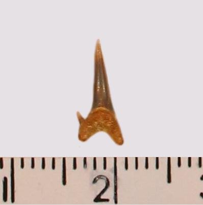 Мелкий передне-боковой? зуб с узкой коронкой темно-серого цвета, режущего типа, с гладким режущим краем. Корень охристый, арочный, умеренно массивный, со следами окатанности. С лингвальной стороны корня питательная борозда. Имелась одна пара добавочных зубцов коронки, сохранился только левый.