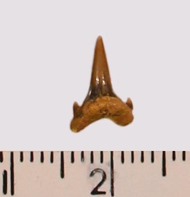 Мелкий боковой зуб с коронкой темно-коричневого цвета, режущего типа, с гладким режущим краем. С лингвальной стороны у основания коронки на эмали имеется скульптура в виде слабой продольной струйчатости. Корень охристый, арочный, умеренно массивный, со следами окатанности. С лингвальной стороны корня питательная борозда. Имеется одна пара добавочных зубцов коронки.