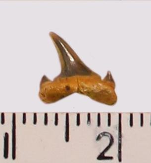 Мелкий задне-боковой? зуб с коронкой темно-серого цвета, режущего типа, с гладким режущим краем. С лингвальной стороны у основания коронки на эмали имеется скульптура в виде слабой продольной струйчатости. Корень охристый, арочный, умеренно массивный. С лингвальной стороны корня питательная борозда. Имеется одна пара добавочных зубцов коронки.