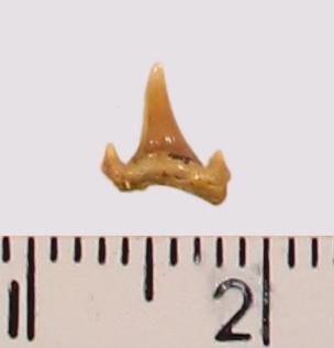 Мелкий задний зуб с коронкой бежевого цвета, режущего типа, с гладким режущим краем. С лингвальной стороны у основания коронки на эмали имеется скульптура в виде слабой продольной струйчатости. Корень светло-охристый, арочный, умеренно массивный, со следами сильной окатанности. Имеется одна пара добавочных зубцов коронки.