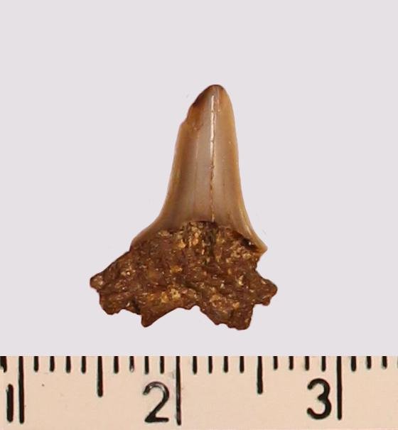 Коронка средних размеров бокового зуба серого цвета, режущего типа, без скульптуры, с гладким режущим краем. Корень бурый, сохранился фрагментарно.
