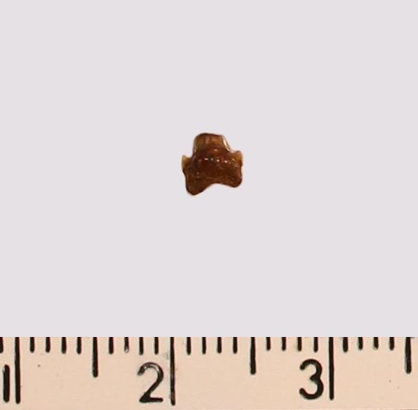 Мелкий задний? зуб с поврежденной сколом коронкой охристо-бурого цвета, с гладким режущим краем. Корень бурый, арочный, умеренно массивный, со следами окатанности. С лингвальной стороны корня питательное отверстие?. Имеется одна пара добавочных зубцов коронки.