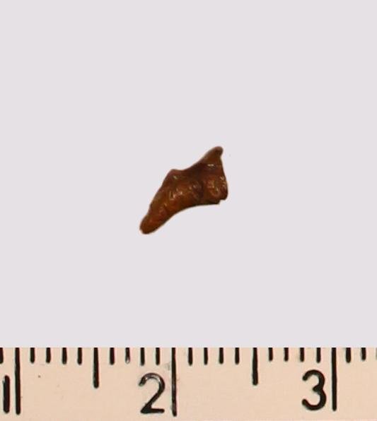Левая ветвь корня мелкого зуба темно-охристого цвета, арочного, умеренно массивного, со следами окатанности. Добавочные зубцы коронки сколоты.