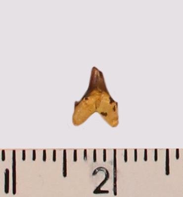 Мелкий боковой зуб с коронкой темно-бежевого цвета, колюще-режущего типа, с гладким режущим краем. С лингвальной стороны у основания коронки на эмали имеется скульптура в виде слабой продольной струйчатости. Корень охристый, арочный, умеренно массивный, со следами окатанности. С лингвальной стороны корня питательная борозда. Имеется одна пара добавочных зубцов коронки.
