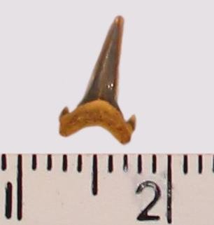 Мелкий боковой зуб с коронкой черного цвета, режущего типа, с гладким режущим краем. С лингвальной стороны у основания коронки на эмали имеется скульптура в виде слабой продольной струйчатости. Корень охристый, арочный, умеренно массивный, со следами сильной окатанности. Имеется одна пара добавочных зубцов коронки.