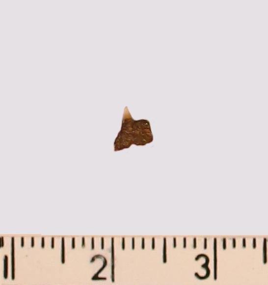 Левая ветвь корня мелкого зуба буро-охристого цвета, арочного, умеренно массивного, со следами окатанности и эрозии. Имелась одна пара добавочных зубцов коронки, сохранился только левый.