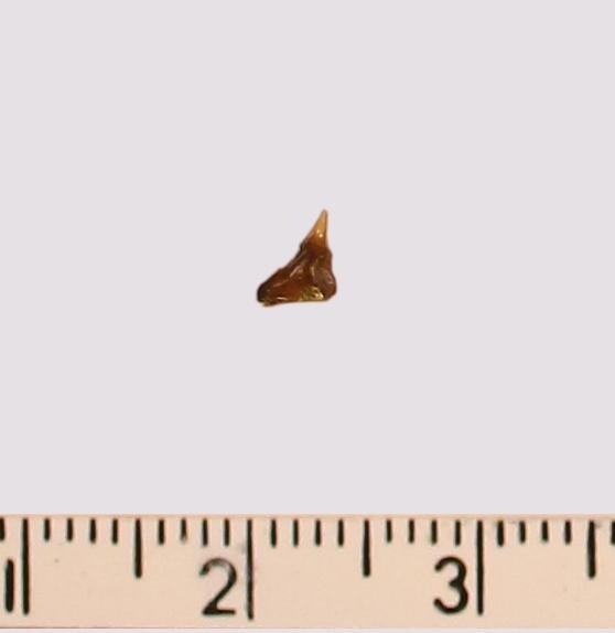 Левая ветвь корня мелкого зуба бурого цвета, арочного, умеренно массивного, со следами окатанности. Имелась одна пара добавочных зубцов коронки, сохранился только левый.