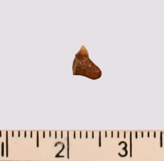 Правая ветвь корня мелкого зуба темно-охристого цвета, арочного, умеренно массивного, со следами окатанности. Имелась одна пара добавочных зубцов коронки, сохранился только правый.