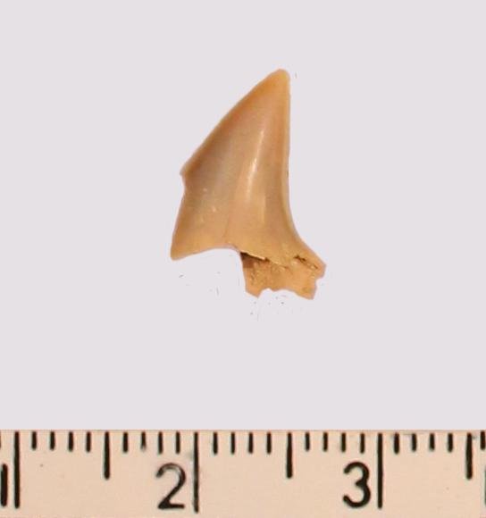 Зуб (фрагмент). Акула. Lamniformes gen. indet. Классификация: Хордовые Chordata, Позвоночные Vertebrata, Хрящевые рыбы Chondrichthyes, Пластиножаберные Elasmobranchii, Акулы Selachii, Ламнообразные Lamniformes