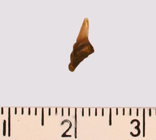 Левая половина мелкого бокового зуба с коронкой охристого цвета, режущего типа, без скульптуры, с гладким режущим краем. Корень буро-охристый, арочный, умеренно массивный, со следами окатанности. С лингвальной стороны корня питательная борозда. Добавочные зубцы коронки отсутствуют.
