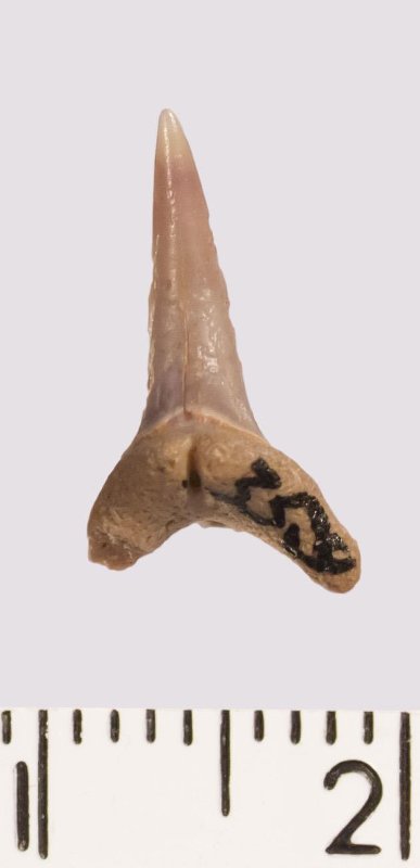 Зуб. Акула. Eostriatolamia venusta Leriche, 1906. Классификация: Хордовые Chordata, Позвоночные Vertebrata, Хрящевые рыбы Chondrichthyes, Пластиножаберные Elasmobranchii