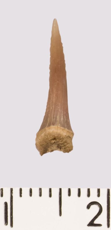 Зуб (фрагмент). Акула. Scapanorhynchus rhaphiodon Agassiz 1843. Классификация: Хордовые Chordata, Позвоночные Vertebrata, Хрящевые рыбы Chondrichthyes, Пластиножаберные Elasmobranchii