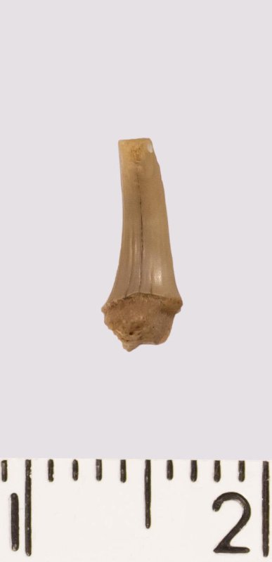 Зуб (фрагмент). Акула. Scapanorhynchus rhaphiodon Agassiz 1843. Классификация: Хордовые Chordata, Позвоночные Vertebrata, Хрящевые рыбы Chondrichthyes, Пластиножаберные Elasmobranchii