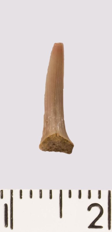 Зуб (фрагмент). Акула. Scapanorhynchus rhaphiodon Agassiz 1843. Классификация: Хордовые Chordata, Позвоночные Vertebrata, Хрящевые рыбы Chondrichthyes, Пластиножаберные Elasmobranchii